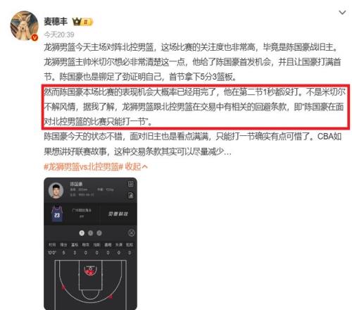 去年休赛期,陈国豪在三方交易中被送至广州队,然而因为“回避条款”,这哥们对阵北控队的比赛只能打一节......