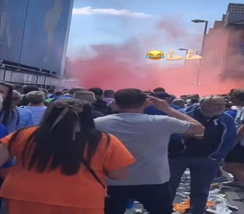 但本该属于蓝色的日子却短暂染上红色,开赛前,球场外街道涌现出散发猩红烟雾的烟火。社交媒体疯传的视频显示,红色烟云飘过古迪逊公园附近连排房屋,引发当地居民哄笑与“亲切问候”。